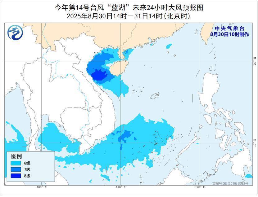 大风预报:8月30日14时至31日14时,南海西部和南部的部分海域、北部湾、琼州海峡、广东西部沿海、广西沿海、海南岛沿海有6-7级大风,其中南海西部的部分海域、北部湾南部海域风力有8级,阵风9-11级。