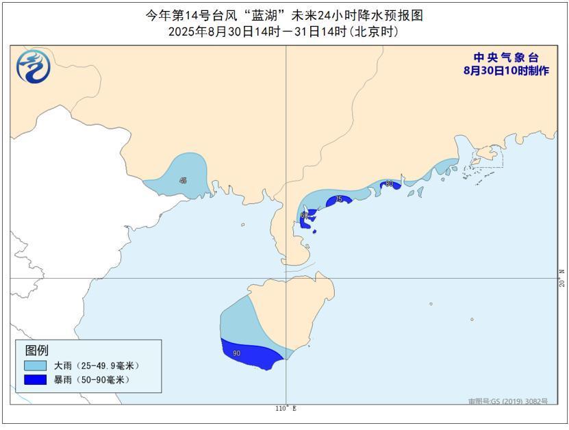 降水预报:8月30日14时至31日14时,广东南部沿海、广西南部、海南岛西部和南部等地的部分地区有大到暴雨(50-90毫米)。